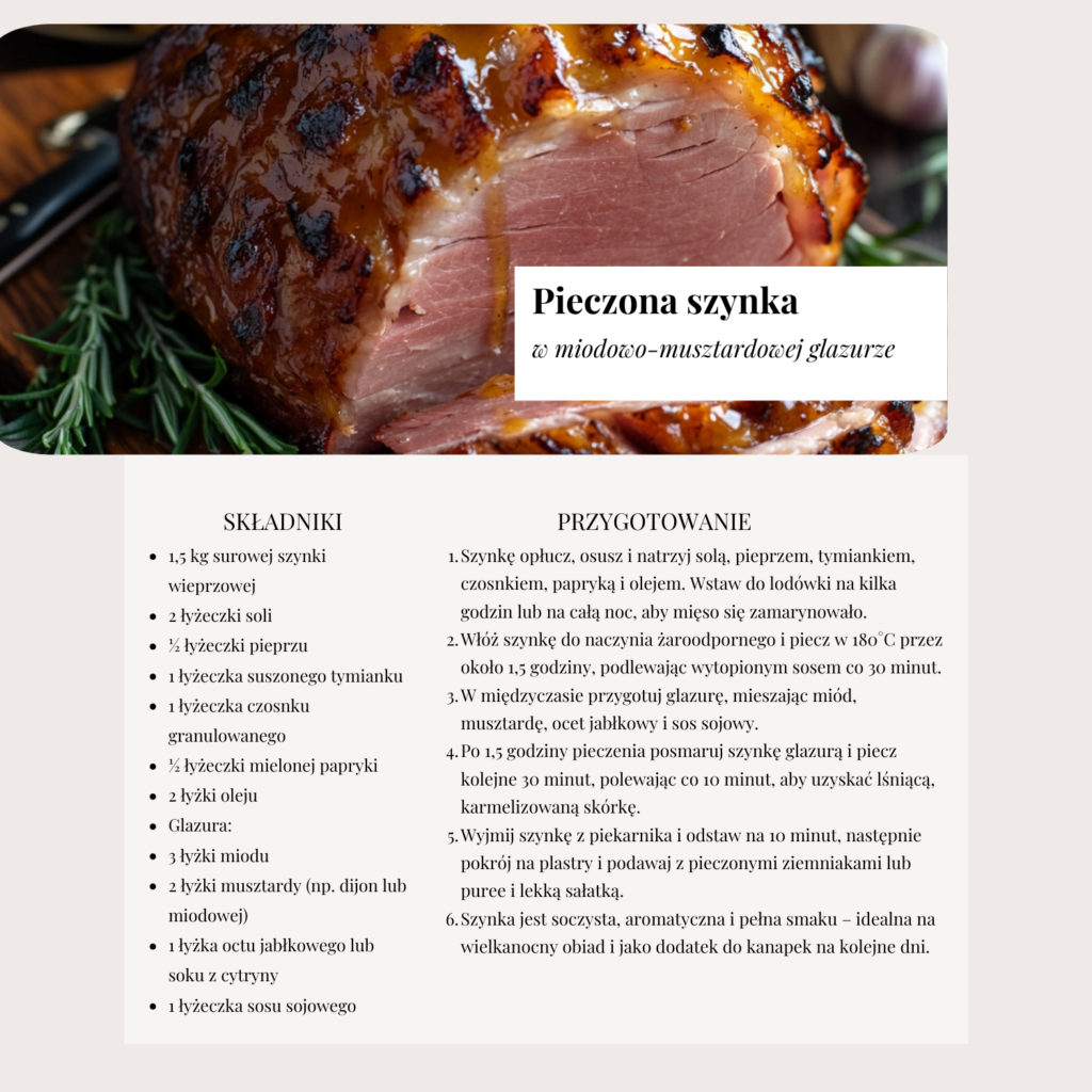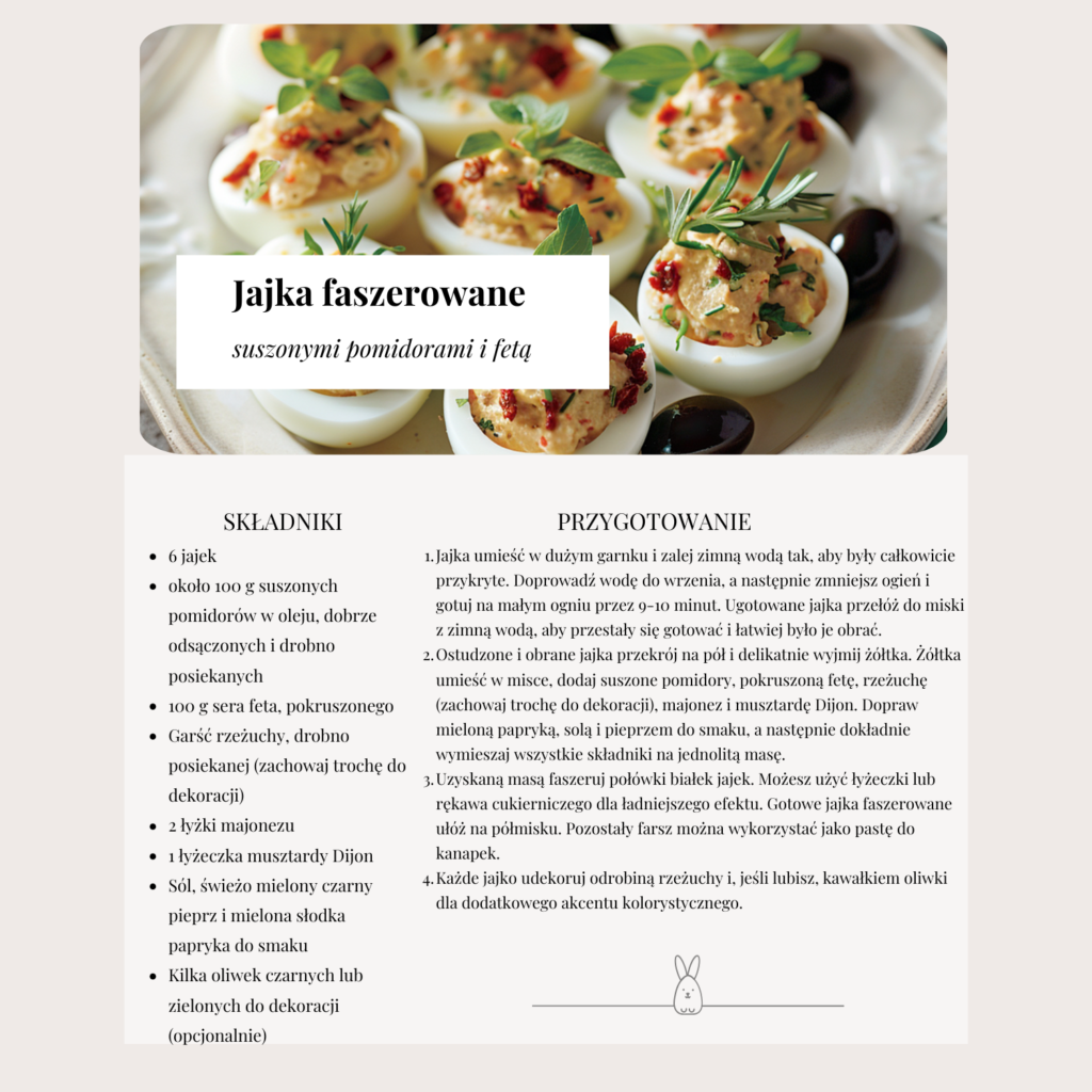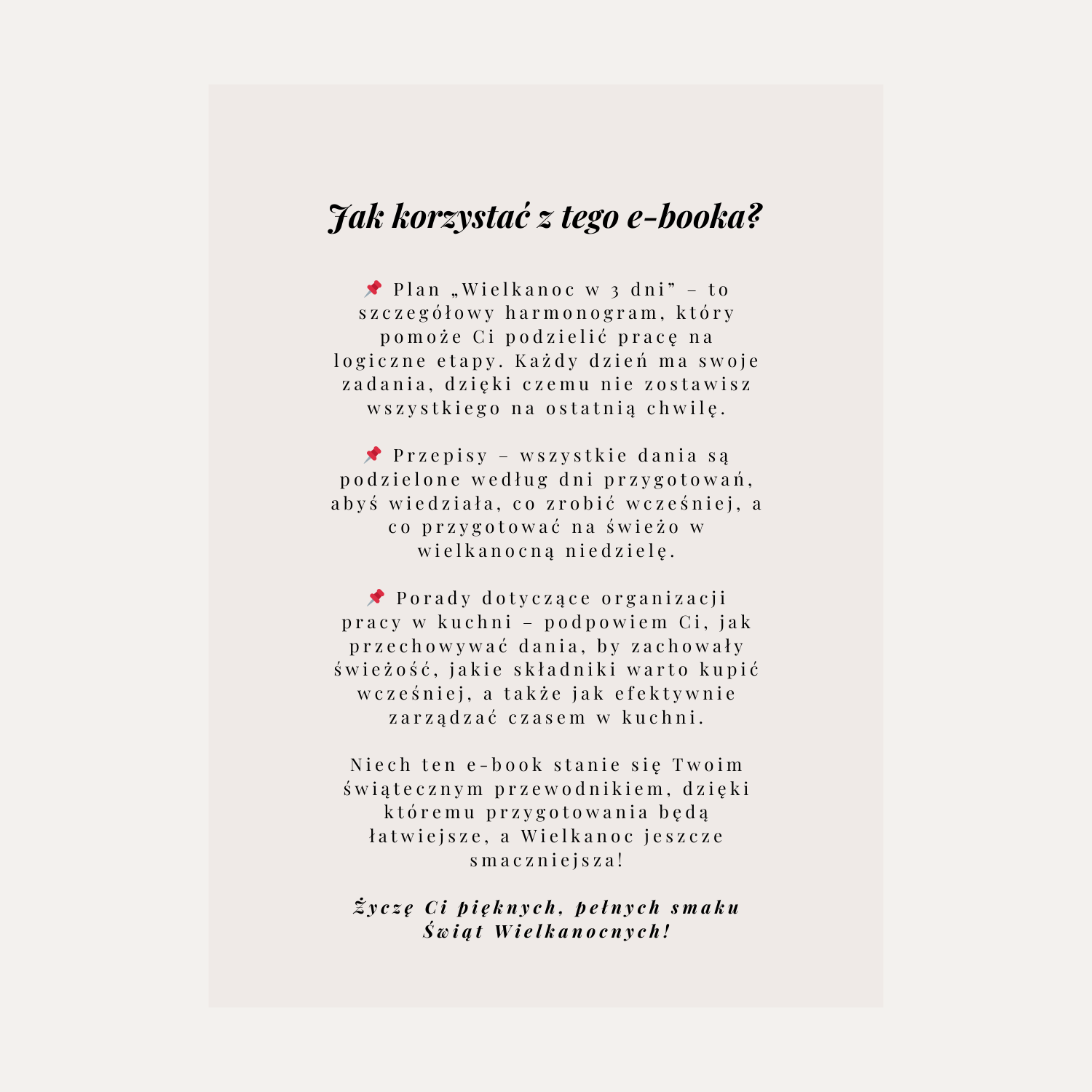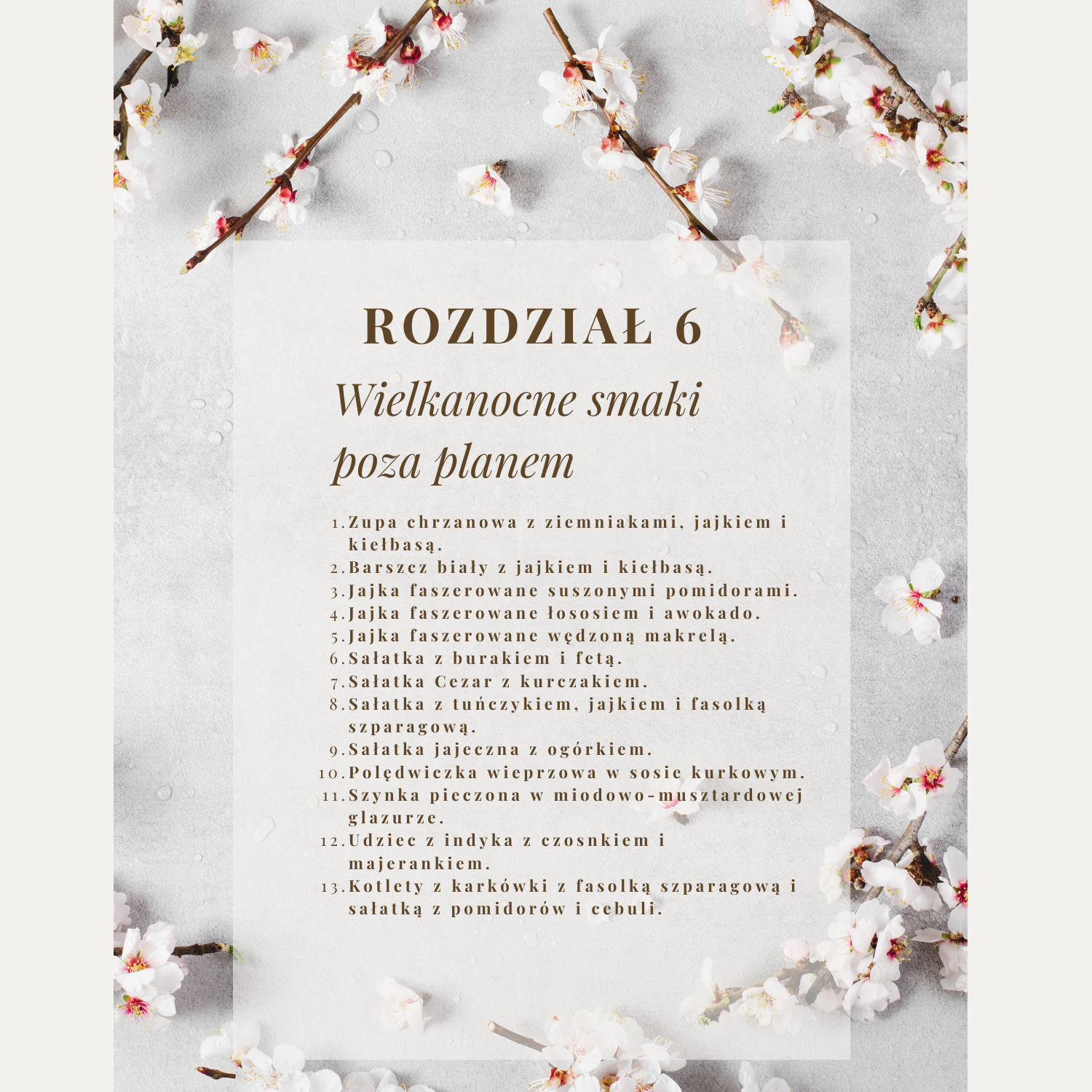 Tworząc „Od żurku po mazurka”, chciałam, abyś nie tylko cieszył/a się pysznymi potrawami, ale także miał/a gotowe inspiracje na wyjątkową atmosferę świąt. Dlatego w ebooku znajdziesz dodatkowe niespodzianki, które sprawią, że Twoja Wielkanoc będzie jeszcze piękniejsza!